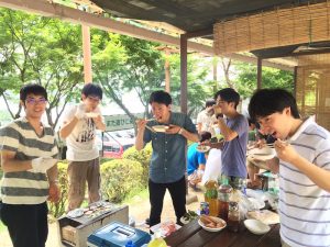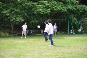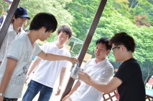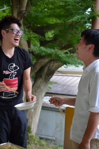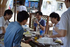 先輩と後輩で仲良く喋りながら食べてます。楽しそう。